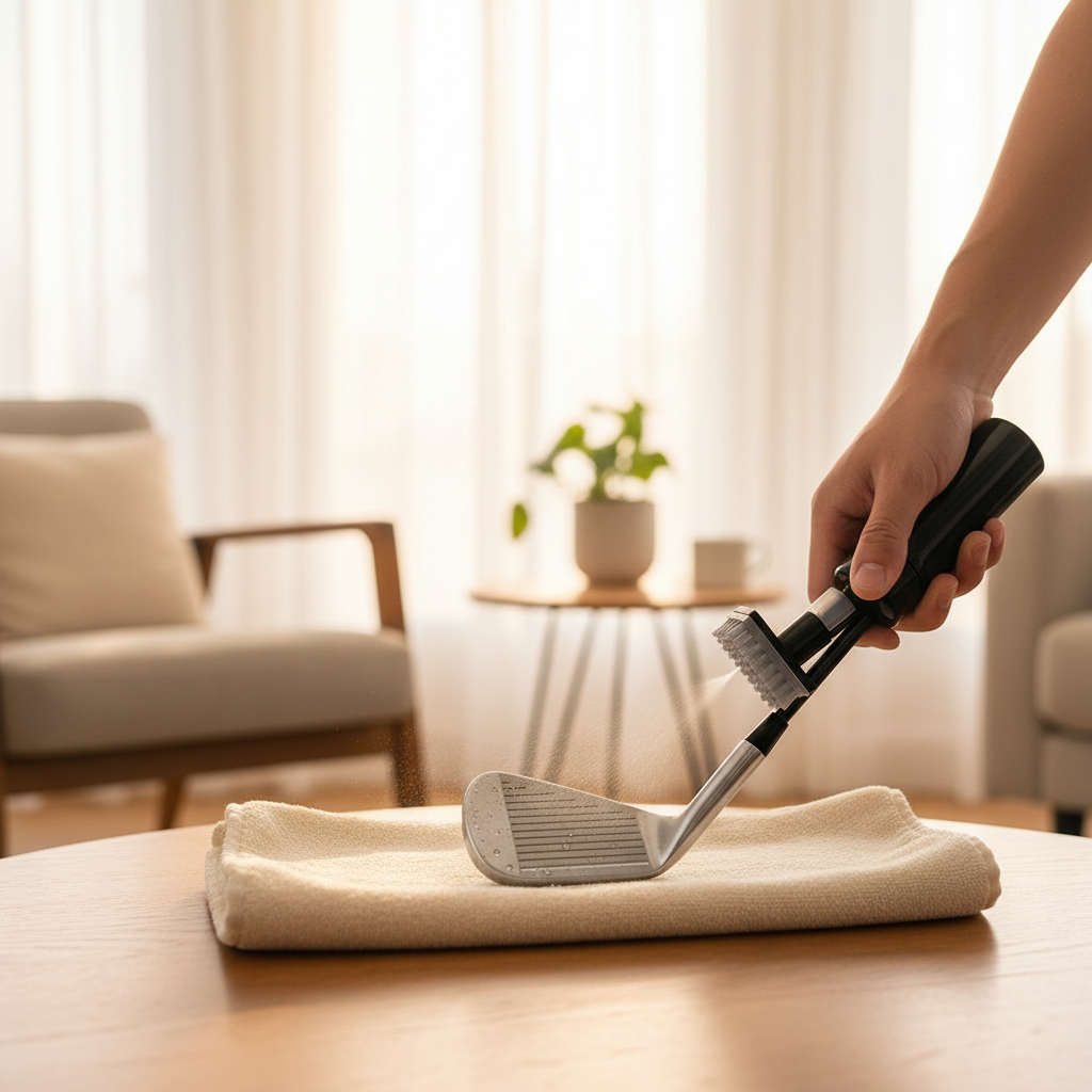 Spray water directly onto club face and grooves thoroughly